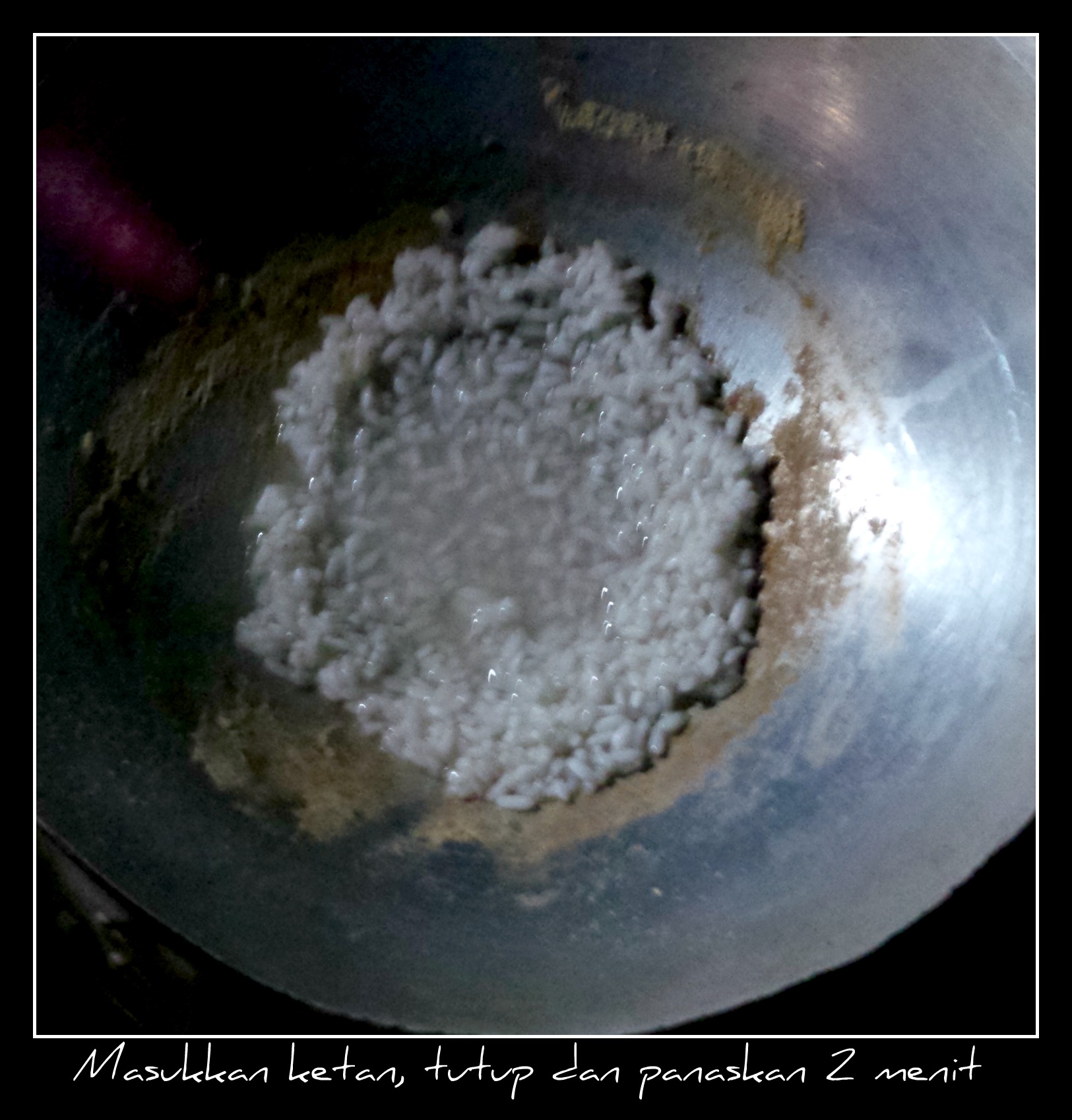Masukkan satu sendok sop ketan yang sudah direndam beserta airnya. Tutup dan biarkan selama 2 hingga 3 menit di atas anglo.
