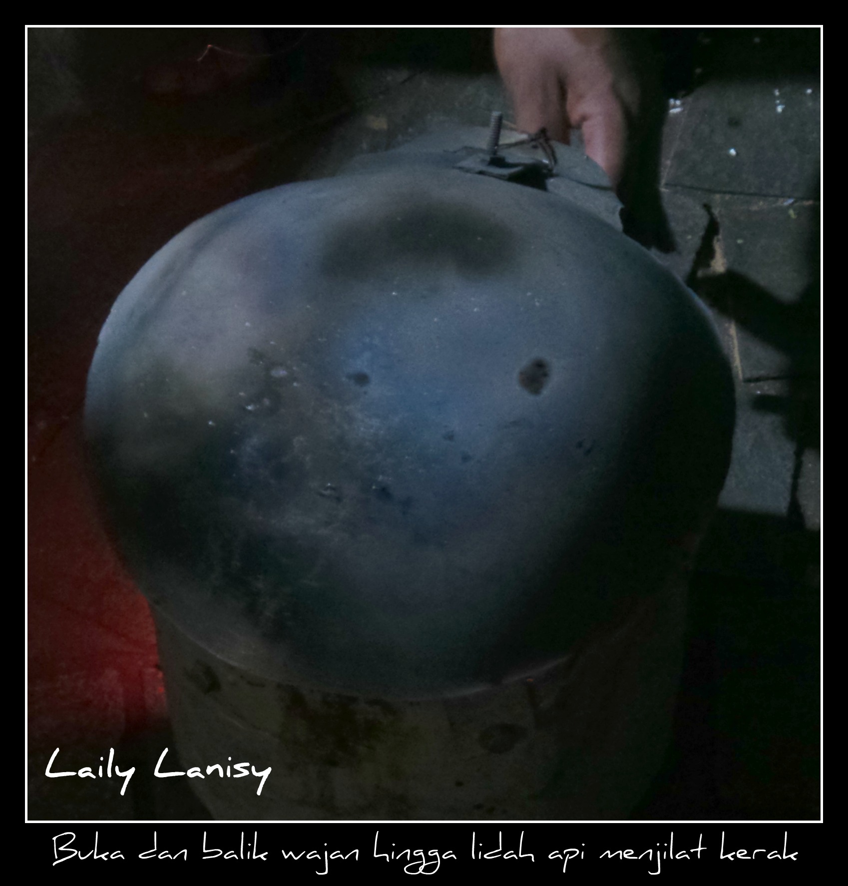 Buka tutupnya dan balik wajan di atas anglo, hingga lidah api menjilat kerak telor.