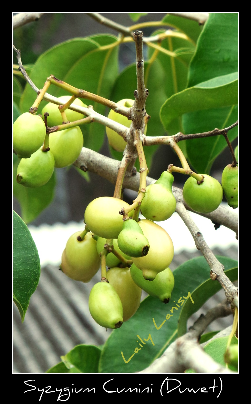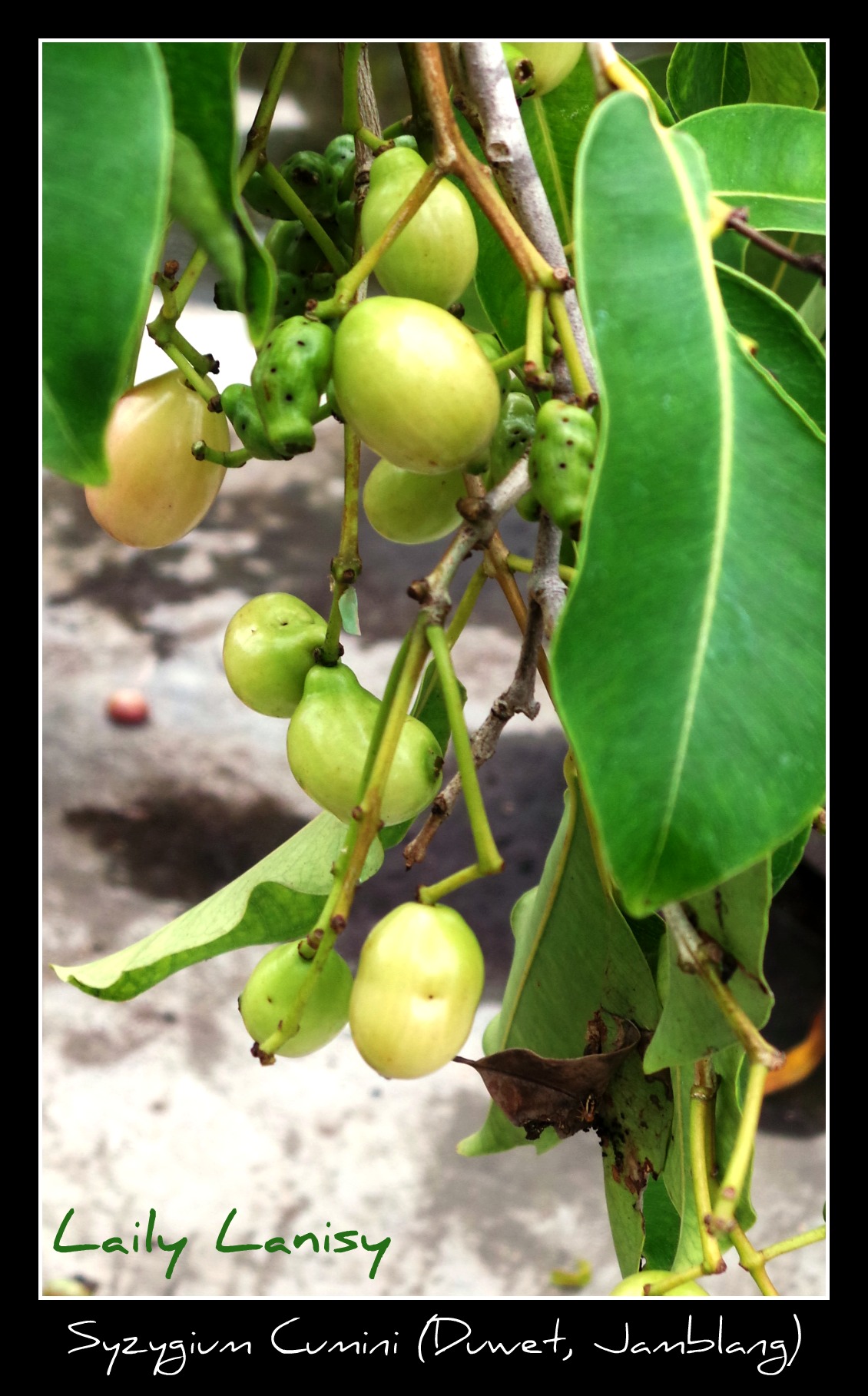 Nah, lantai cor-coran yang lumayan luas ini oleh mbak Ninik dimanfaatkan untuk bercocok tanam. Saya tidak pernah naik ke atas, dan mungkin tidak akan pernah naik ke atas kalau saja pada kunjungan saya ke Yogya minggu lalu (6 Desember 2013), mbak Ninik tidak menawari saya buah duwet (jamblang) berwarna putih. Sudah puluhan tahun saya tidak menyantap buah ini. Ternyata enak. Manis agak sepet. Walapun warnanya tidak ungu, tapi rasanya persis seperti buah duwet masa kecil saya dulu.