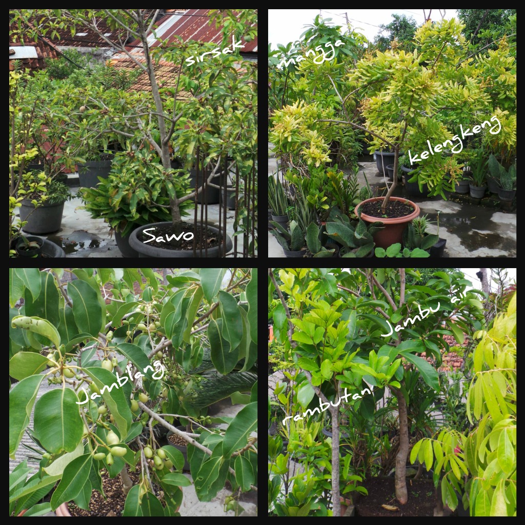 Selain pohon duwet ternyata koleksi tanaman buah dalam pot mbak Ninik lumayan banyak. Ada sirsak yang kata Mbak Ninik pohonnya merupakan cangkokan dari pohon sirsak di Villa Batu, rambutan, kelengkeng yang mulai berbunga, jambu biji merah.