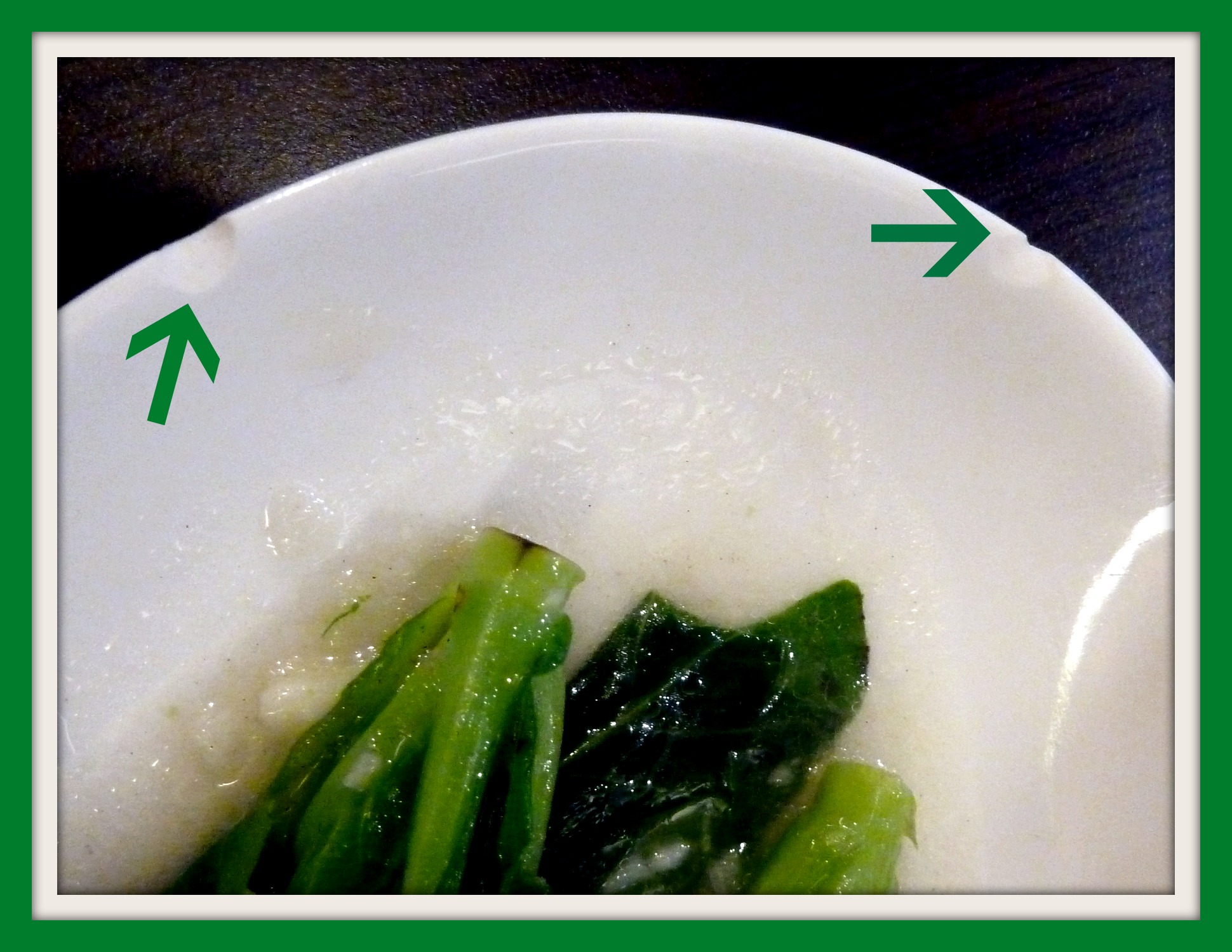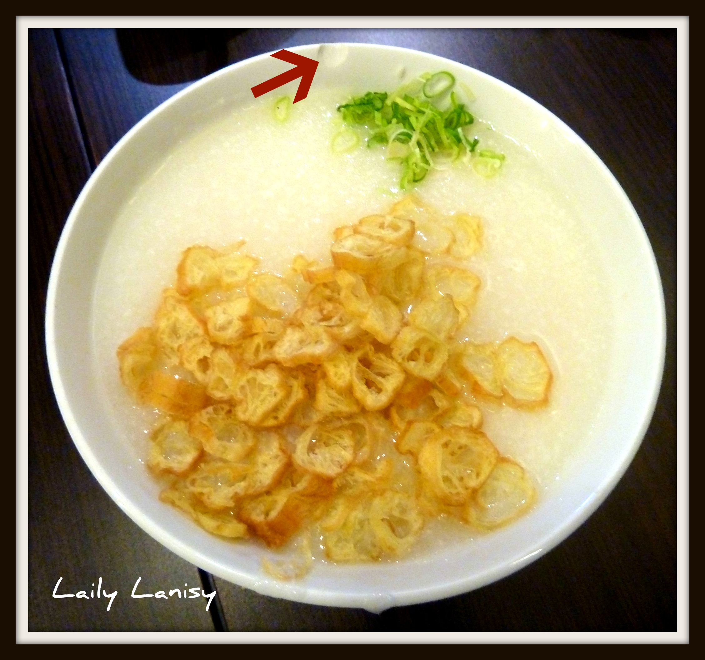 Dari segi lokasi, tempat ini OK sekali. Kalau tidak sempat sarapan di rumah, dalam perjalanan ke kantor bisa mampir dulu sebentar untuk menikmati bubur. Dari segi rasa – walau pun tidak istimewa – enggak ada keluhan lah. Dari segi penyajian… Waduh … masak di tempat yang terbilang mewah ini bubur disajikan di dalam mangkuk yang sudah gempil. Ah, mungkin kebetulan dan hanya satu saja!!! Ternyata cah caimeonya juga disajikan di dalam piring gempil juga.