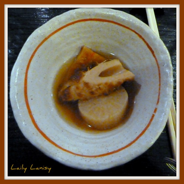 Malam ini saya memulai dengan satu mangkok kecil Oden. Sambil menunggu Teppanyaki seafood dan sayuran dimasak, saya menikmati chawan mushi dan sashimi. Sehabis teppanyaki dilanjut dengan tempura dan yakitori. Sebenarnya saya tergoda untuk mencicipi Ramen yang kata Maga enak sekali, tetapi perut saya sudah mulai penuh. Tapi enggak menolak ketika berbagi Pizza Jepang yang bertaburkan seaweed, telor salmon dan cheese.